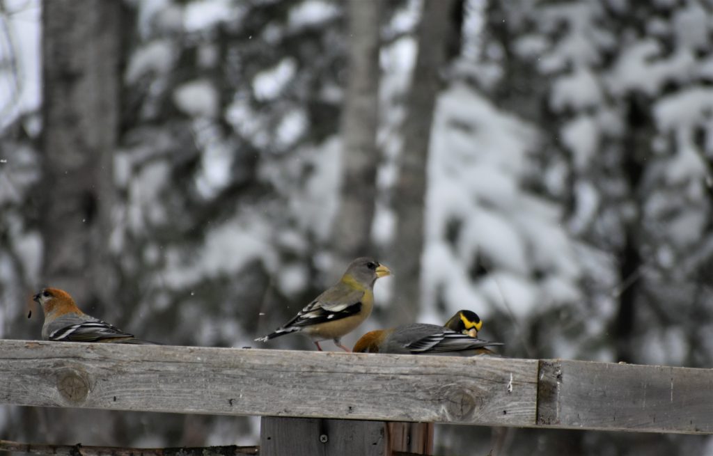 Female and Male Evening Grosbeaks with Female Pine Grosbeaks.