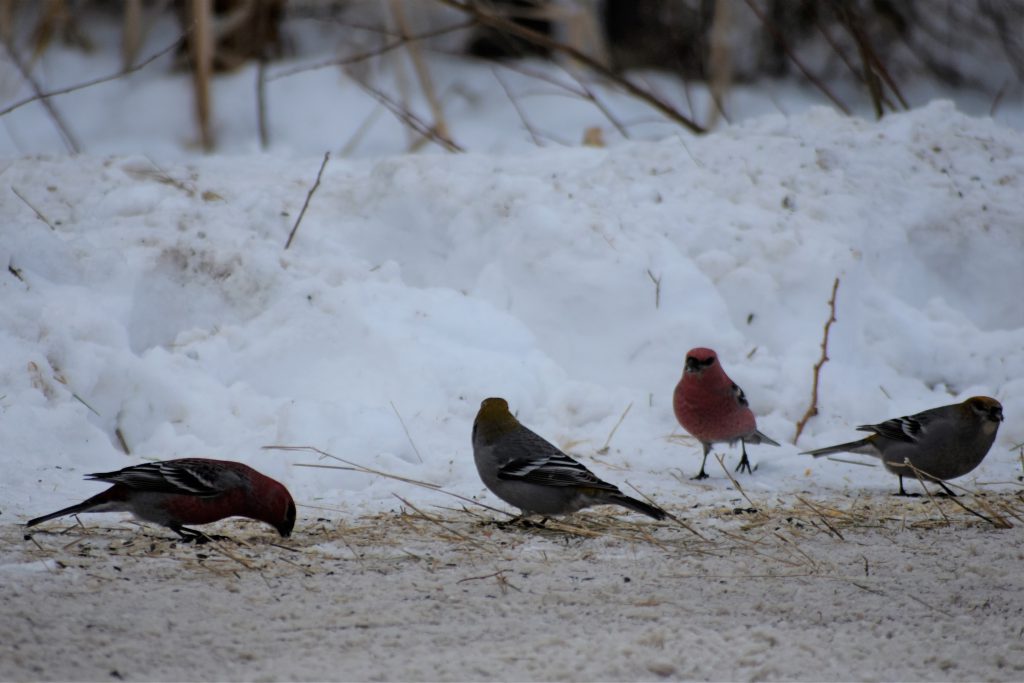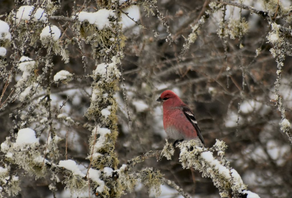 After that, I wanted to try the Admiral Road feeders, which the map calls ‘the best place in the state to see and photograph Boreal Chickadees’. We didn’t find any of those, but we did see some Canada Jays, a Hairy Woodpecker, lots of Black-capped Chickadees, and another flock of Pine Grosbeaks, which I got some good shots of. The chickadees had a habit of deciding they’d eaten enough and whizzing right past someone’s ear to the trees on the other side. It was funny, but definitely startled me if they caught me off guard!