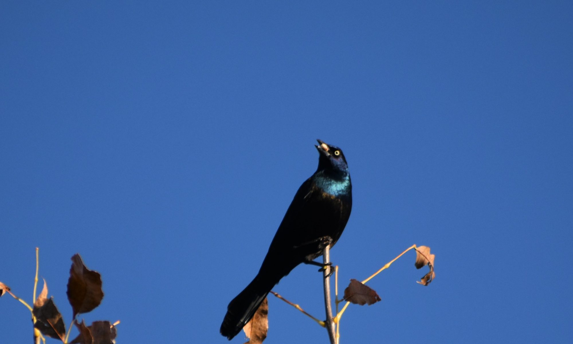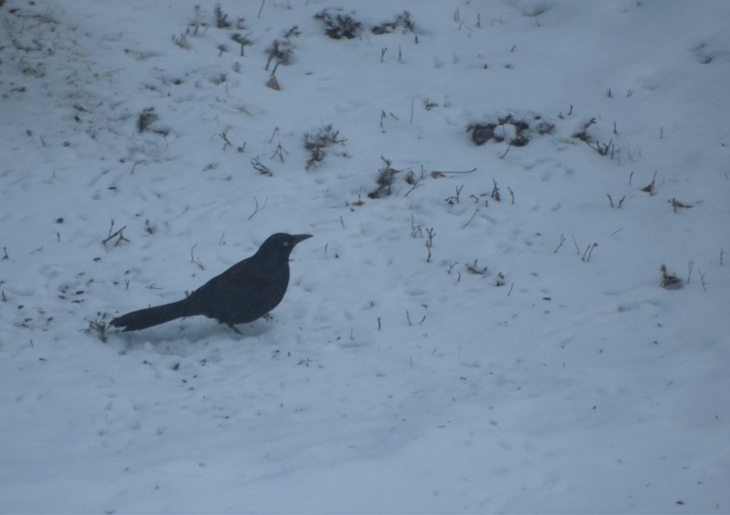 With COVID restrictions and below-freezing temperatures, I haven’t been going out beyond my own yard much. It can be pretty depressing when your birdwatching is limited to the chickadees out your window! Still, I’ve had a pretty great week. On Tuesday, I reported the Common Grackle that’s been hanging around my feeders all winter to eBird, and it counted as a rarity for this time of year, which was pretty exciting for me. Grackles are normally migratory birds, and all the others flew south last October. This guy, though, stuck around. I was an hour into watching the feeders when he showed up for just a few seconds, but I spent another half-hour waiting for him with the camera until he came back long enough to photograph! It payed off plenty, though, to get those shots.