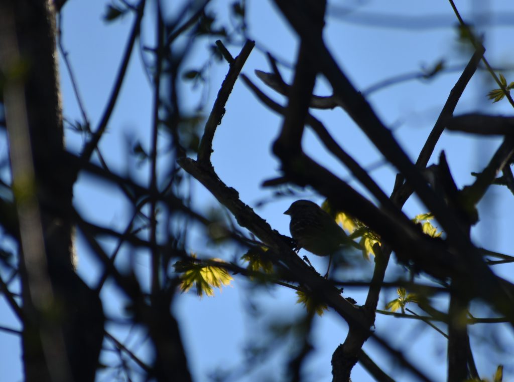 For instance, while I was reviewing and editing pictures for the blog, I noticed one photograph of a House Sparrow, taken in the evening – with the light behind it, all you could see was a dark silhouette of the bird and the branches all around it. I was about to delete it, and look for a more blog-worthy image, when something about it caught my attention – the new, half-opened leaves, with the light shining through them, looked almost like flowers. It was almost the only color in the image, and the bird added a special element to it. It made a very interesting image!