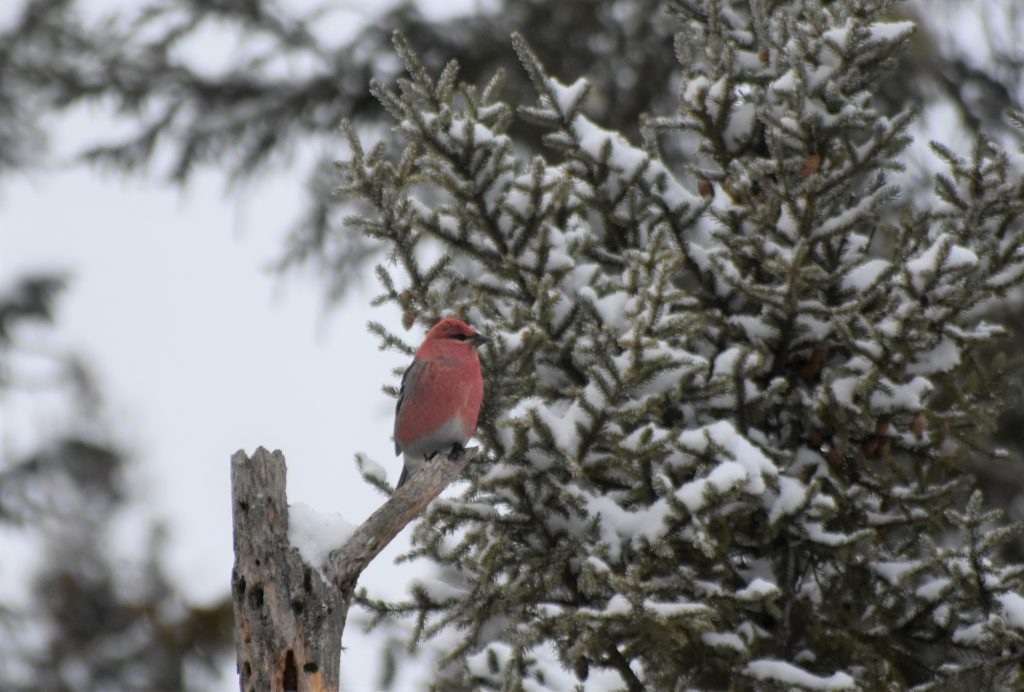 There didn’t seem to be anything but chickadees on the feeders in front of the center, so we went to the back to check out the tray feeder and deer carcasses (yeah, super gross, but do you know a better way to draw in Canada Jays?). As we headed that way, I looked up at the trees and saw a really tall one at the edge of the woods with a single bird at the top. I looked at it through my binoculars, and couldn’t make out what kind of bird it was, but I had a feeling, from the shape of the beak and the reddish color it seemed to have, what it might be. I started to say my suspicion aloud, but before I could, we came to the feeder, and what to my wondering eyes should appear but a whole flock of that same species- Pine Grosbeak! Lifer three, just like that! I love Pine Grosbeaks, with the males’ strawberry-pink color and the females’ yellowish and gray one- they’re so pretty, and all around awesome, of course. I took lots of photos of them and the flock of Evening Grosbeaks, which decided to try out the feeder as well; then we took one of the short trails near the Welcome Center, which didn’t yield any new species but was still really nice. We had to be careful not to bump into any trees and send down a flurry of snow from their branches!