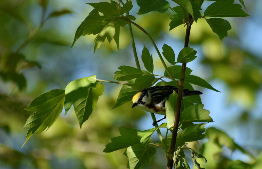 This gorgeous warbler species, seen only once by John James Audubon himself (despite his best efforts), was a surprise addition to my life list last May, when I looked up at the right moment and was treated to a bird at the top of a tall tree. I kept my eye on it as it hopped from branch to branch until it finally came close enough to ID as a male chestnut-sided! He came lower after that, and I managed some good pictures of him before he flew away.